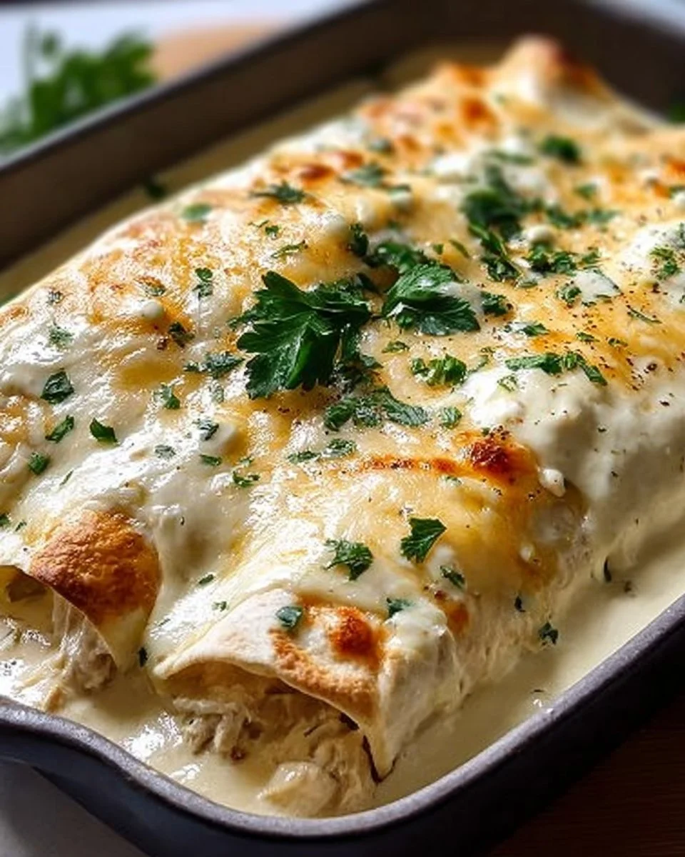 Comforting chicken enchiladas with a velvety white sauce, perfect for family gatherings.